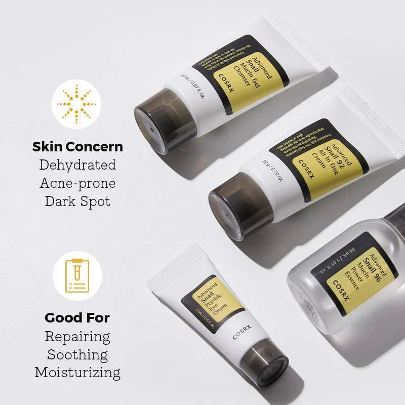 COSRX's Most Loved 4-step Advanced Snail Trial Kit : Skincare essentials formulated with snail mucin for repairing, moisturizing, and soothing skin.
